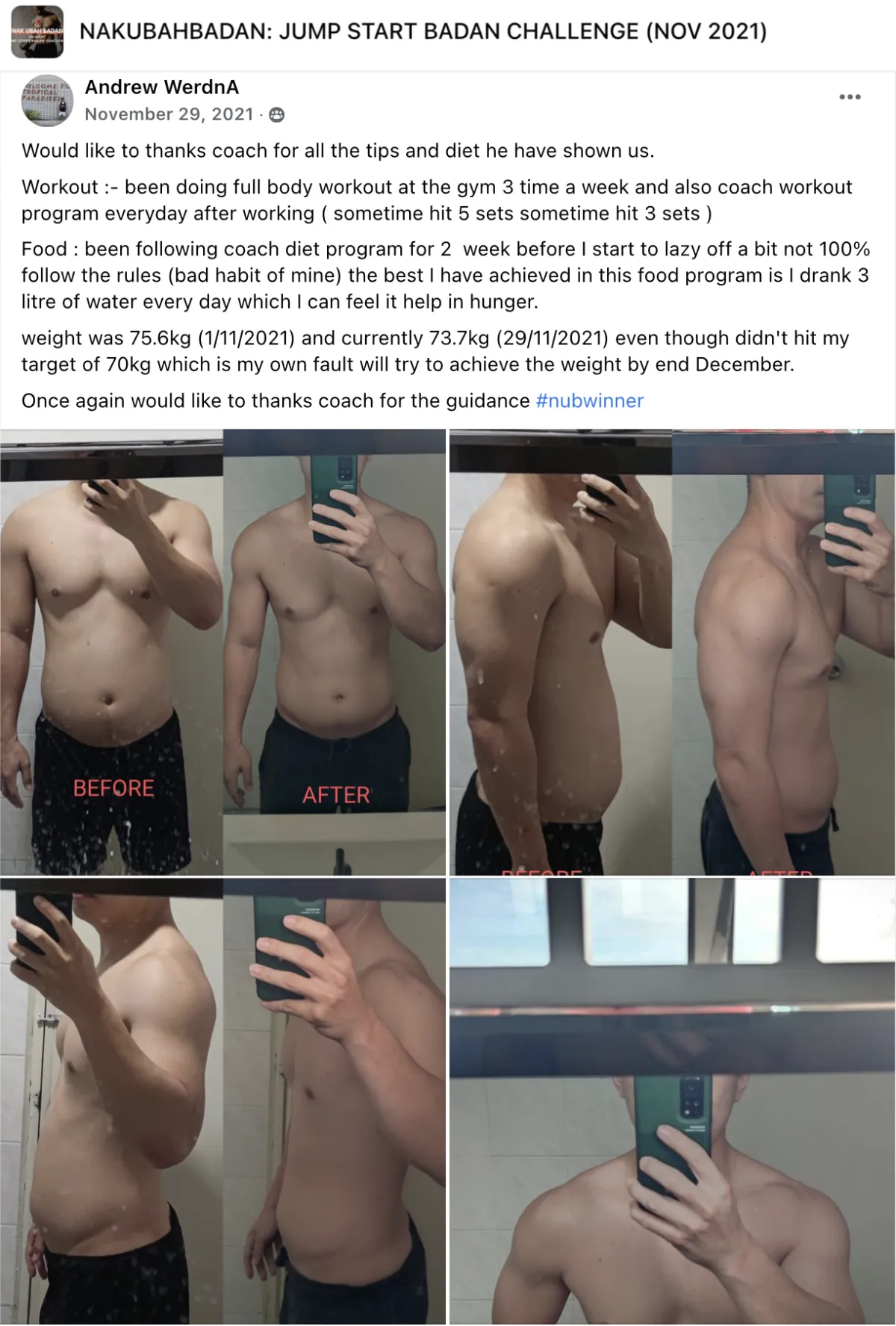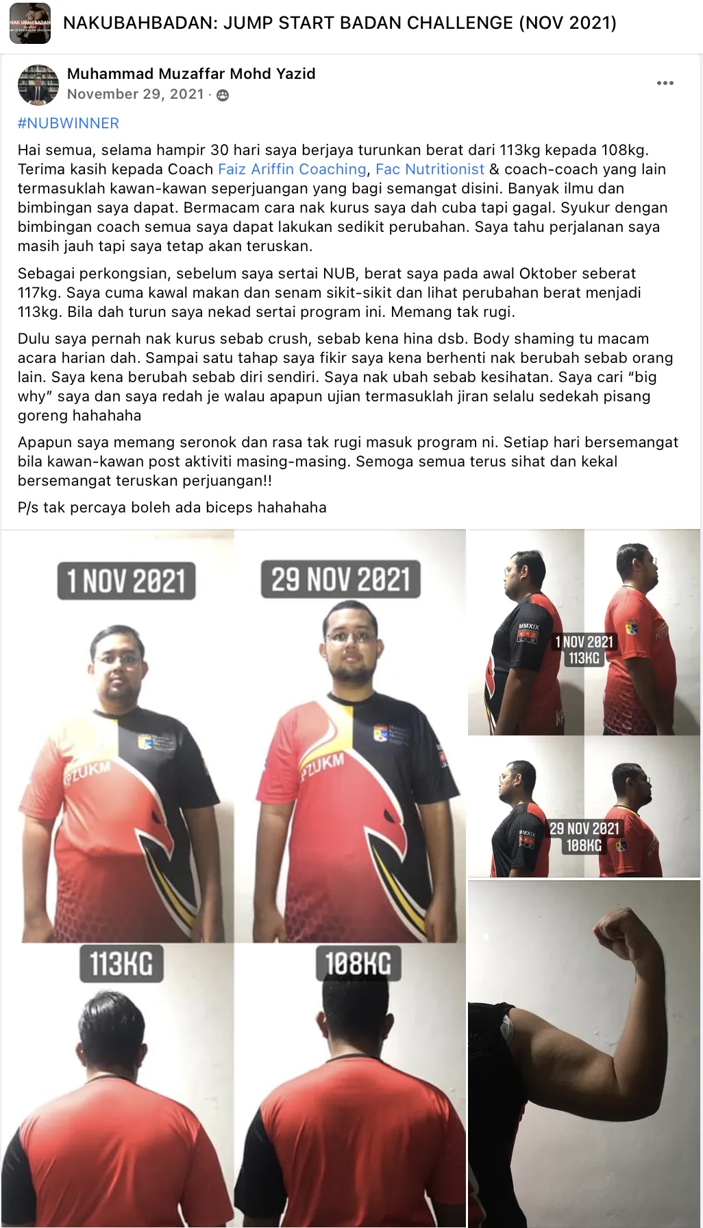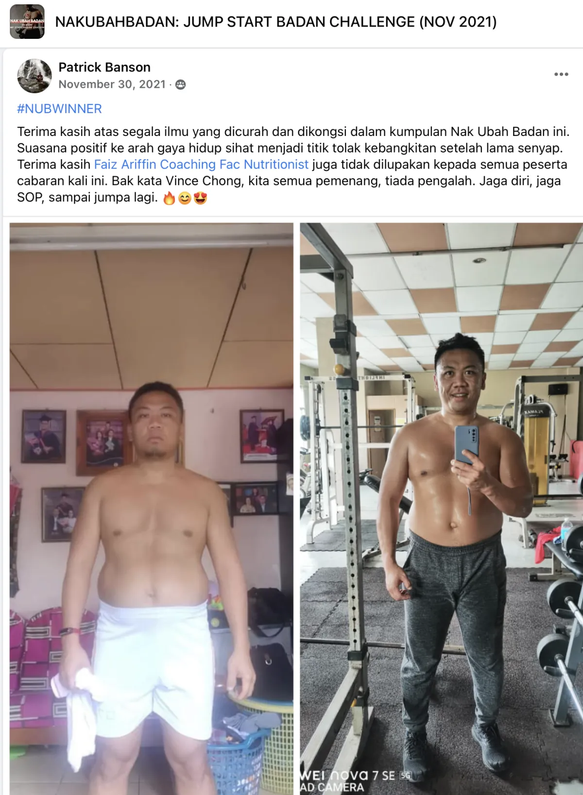 Beliau juga merupakan World Champion dalam bidang bodybuilding, menjadikan beliau bukan sekadar coach teori, tetapi coach yang benar-benar faham bagaimana badan berfungsi dan transform.